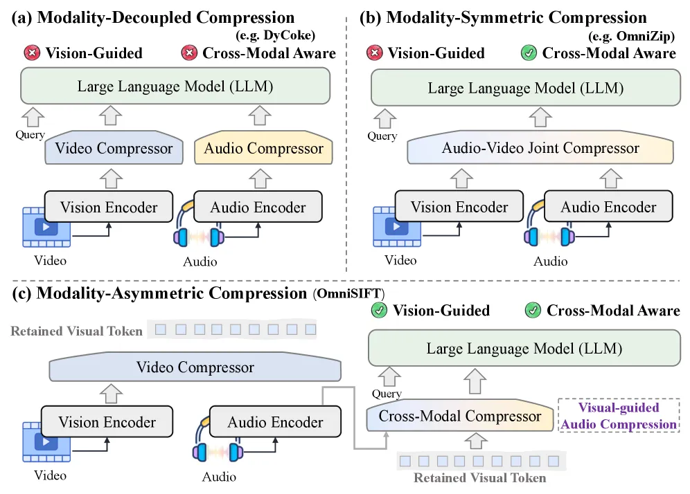 论文把 Omni-LLMs 的 token 压缩分为 3 类范式