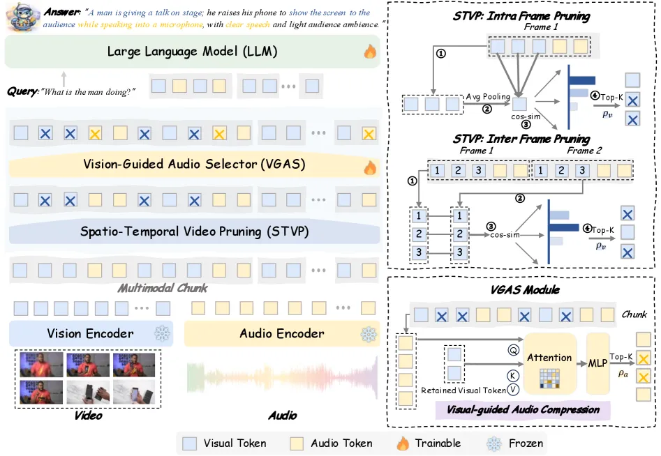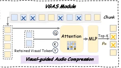 VGAS ( Vision-Guided Audio Selector ): 用 V token 引导 A token 压缩