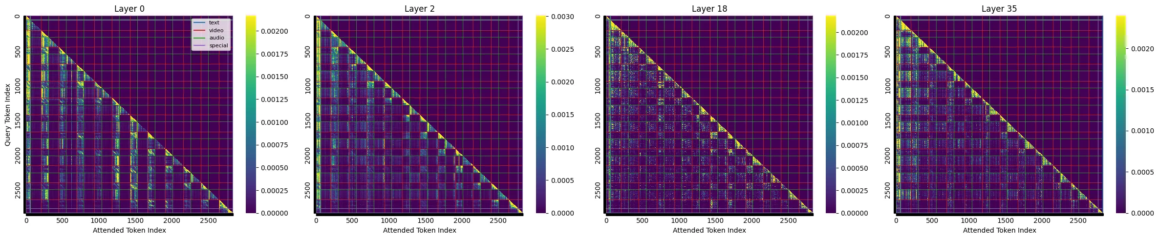 早期层中音频 token 占据了相当高的注意力,随着 llm 层数加深,注意力逐渐分给部分视觉 token