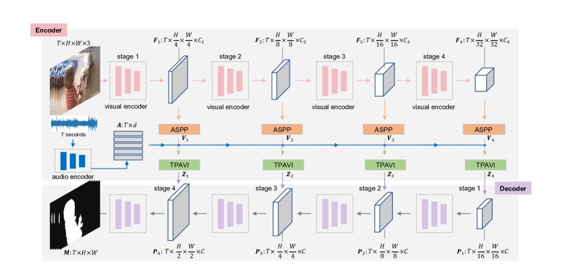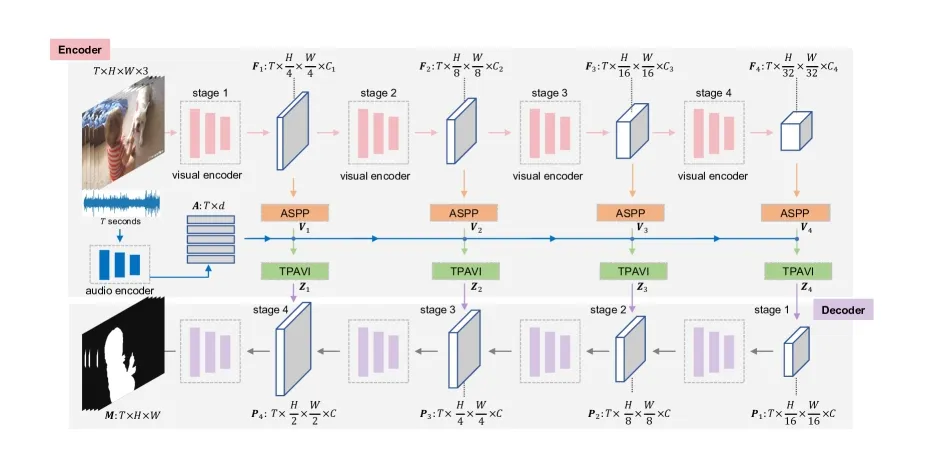 同时在视觉语义分割结构的基础上引入了音频分支和一个关键的融合模块——TPAVI (Temporal Pixel-wise Audio-Visual Interaction)。