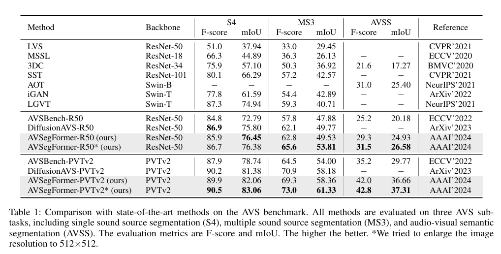 - 实验在 AVSBench 三个子任务上全面超越当时 SOTA;