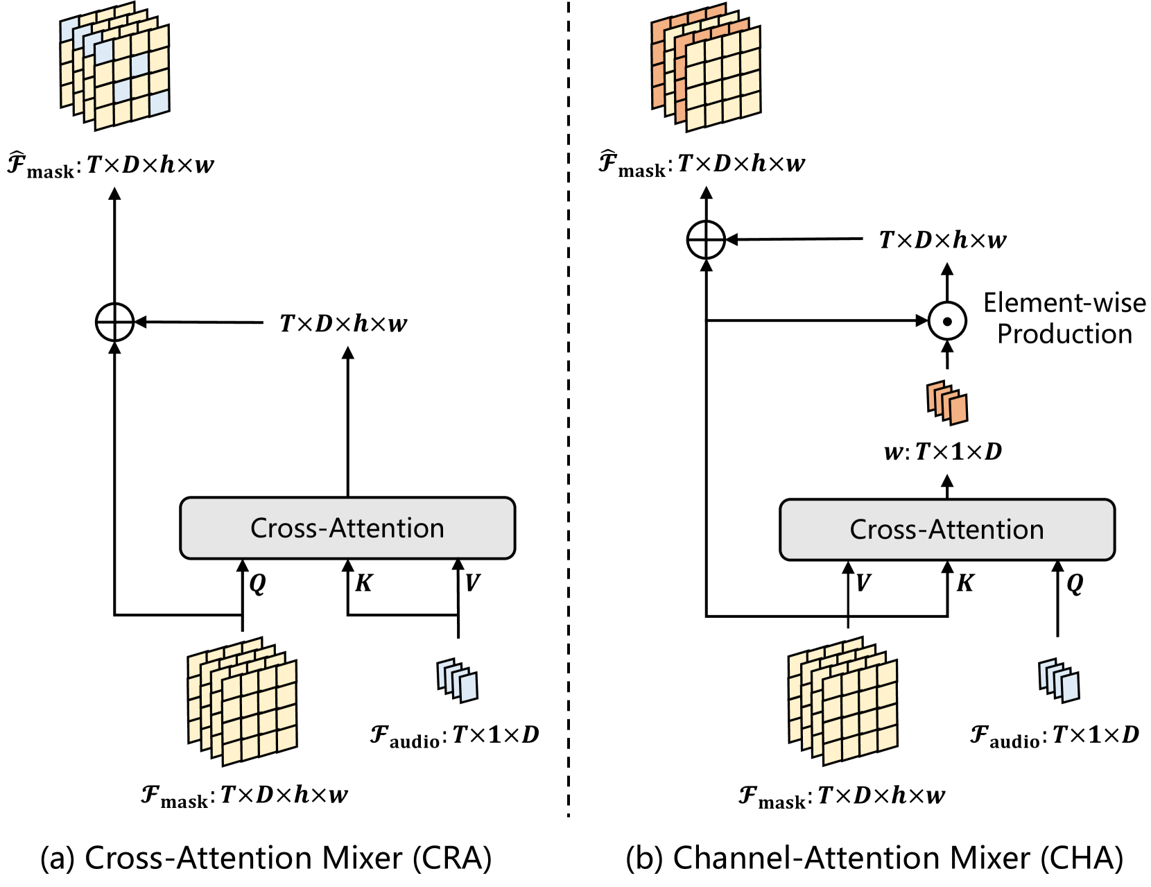 - 视听混合器(Audio-Visual Mixer) 对比了两种设计:交叉注意力混合器(CRA)与通道注意力混合器(CHA)。结果表明 CHA 明显优于 CRA, 能够更稳定、更有效地利用音频语义调制视觉通道, 实现对发声物体的增强与背景的抑制。