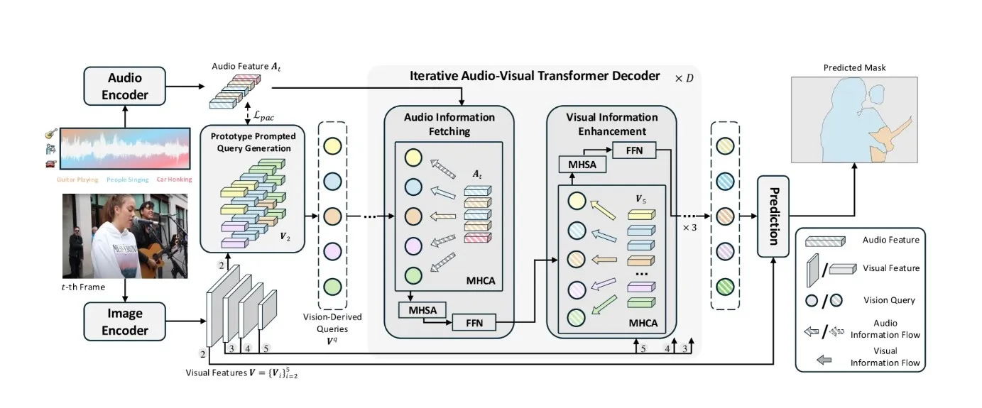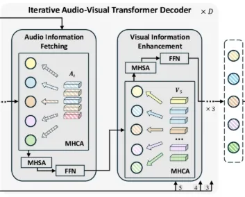 为了让这些查询进一步理解该区域是否在发声(音频关联)和发声物体的形状与边界(视觉细化), 作者设计了一个迭代式(iterative)音视 Transformer 解码器来持续融合音频与视觉特征, 实现逐步精炼。