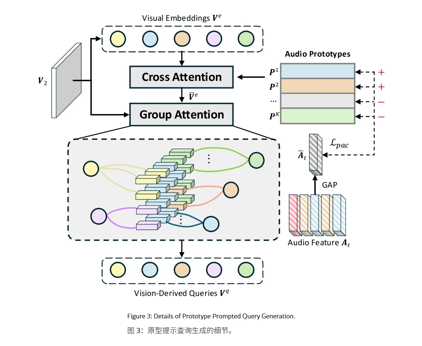 这一步就是把音频信息通过和随机音频原型做一个对比学习, 训练出一个音频原型, 使它们具备区分类别的能力。然后过 Cross Attentio 让视觉查询动态聚合对应的音频特征。
